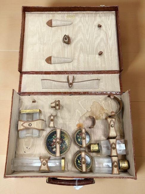 A fine part-dressing table set, seven pieces silver-gilt and painted including bottles and jars, in alligator case retailed by Finnegans of Bond Street, marks for Henry Clifford Davis, Birmingham 1947
