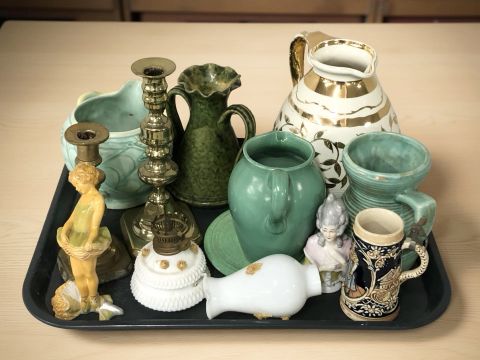 Assorted ceramics including Arthur Wood, Dee Cee, a porcelain half-doll, an oil lamp base, two brass candlesticks, etc.