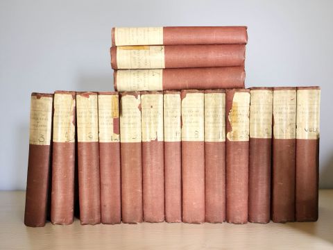 Strickland, Agnes : Lives of the Queens of England, from the Norman Conquest, in sixteen volumes with plates, publisher Eveleigh Nash, London, 1905, from 250 copies of this edition printed, on hand-cut paper, red cloth bound. (16)