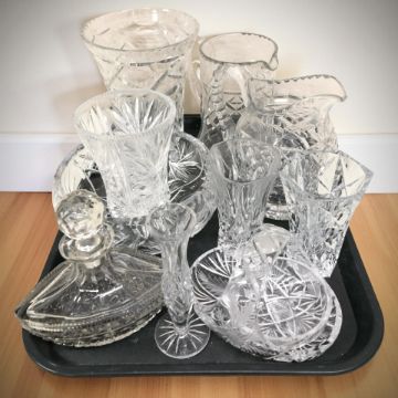 A group of crystal vases, decanter, basket, jugs.