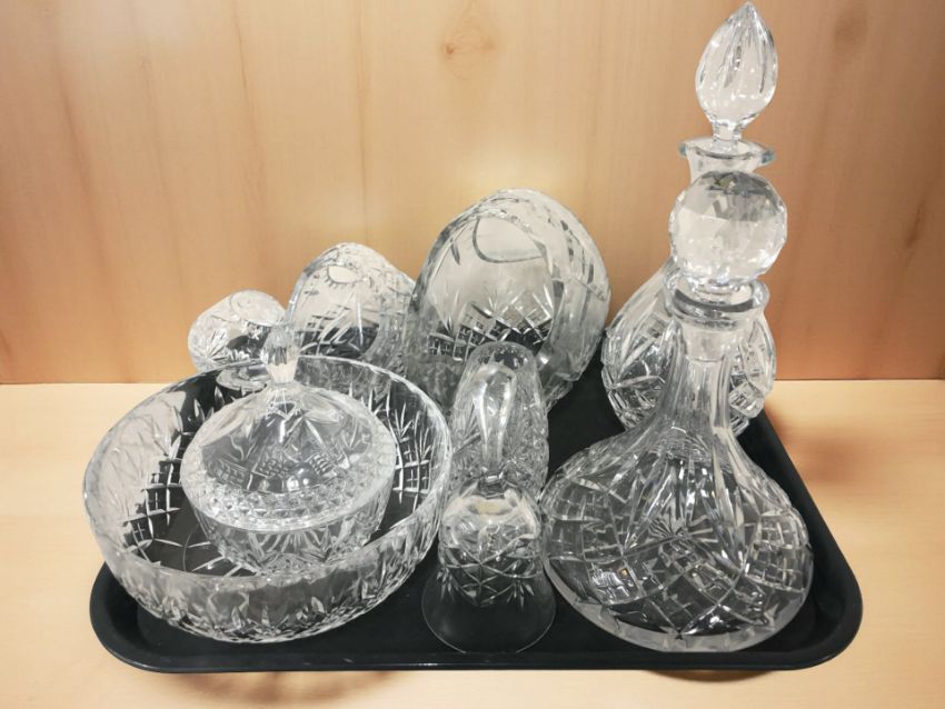 A ship's decanter, further decanter, two baskets, fruit bowl and other crystal.