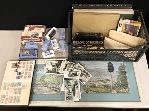 A group of die cast cars including Corgi, a Revell MGB sports car modelling kit, postcards, atlases, Lord of the Rings special centenary limited edition set of cassette tapes, two framed watercolours, etc. (1 box)