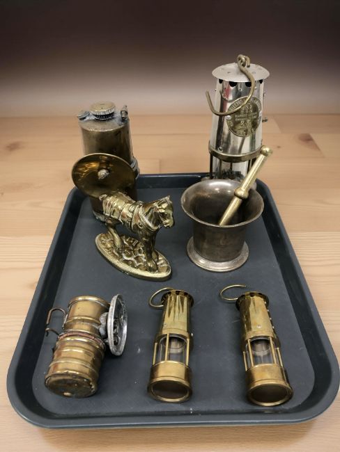 An Eccles Type 6RS miner's safety lamp, together with a Miller brass carbide lamp, similar Premier lamp, a mortar and pestle, two miniature miner's lamps and a brass figure of a horse.