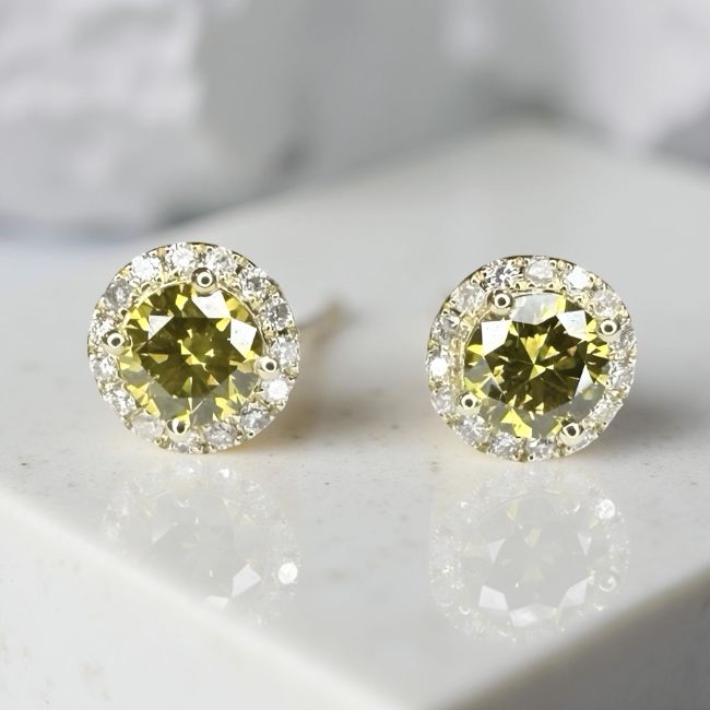 A pair of 14ct gold yellow diamond stud earrings, the principal stones having a combined weight of 1.34 carat. With certification.