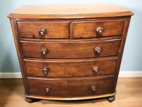 A Victorian mahogany bow front five drawer chest, 110 cm x 52 cm x 108 cm.