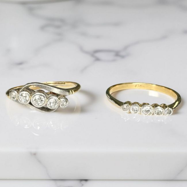 Two antique 18ct gold five stone diamond rings, sizes N and O.