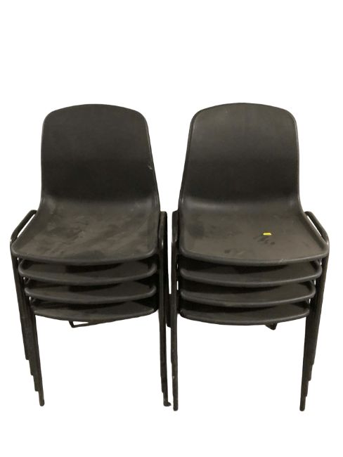 A set of eight moulded plastic stackable chairs.