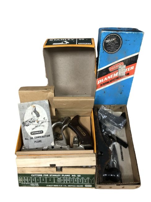 A Stanley 50 combination plane in box with cutters and a Paramo plane metre model 10 in box