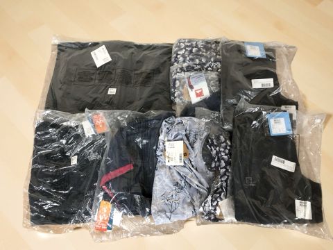 A group of clothing to include Salomom waterproof running pants size M, Mountain Warehouse women's shortsleeve protective dress, further women's vest, etc. (All brand new with retail tags, 1 box)
