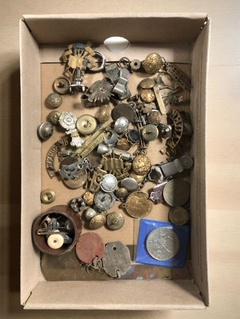 A pair of Second World War British dog tags, stamped 'Kitchenn C.E. 60837, West Yorks', together with a quantity of military cap badges and buttons, dress studs, 1977 jubilee crown, etc.