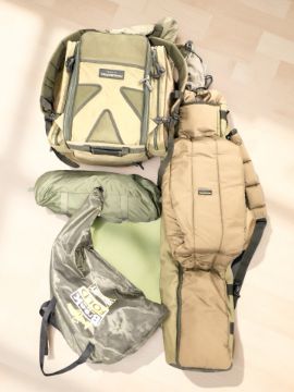 A Korum Transition back pack, landing net, 3m x 3m tarp, etc