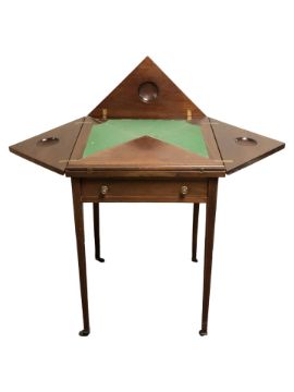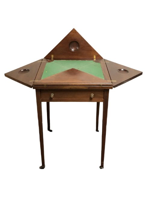 An Edwardian mahogany and satinwood-banded envelope card table, unopened 50 cm wide.