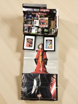 Star Wars collectibles including Monopoly set, reference books, mugs, pictures, etc. (1 box)
