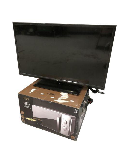 A Logik 32 inch LCD TV with lead no remote and a microwave in box