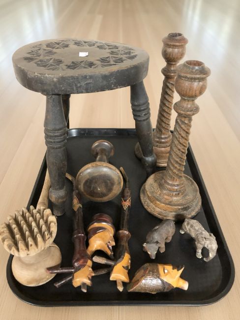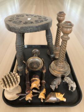 A small carved oak tripod stool and other treen including carved wooden pipes, small Black Forest wooden bear and similar elephant, barley twist candlesticks etc