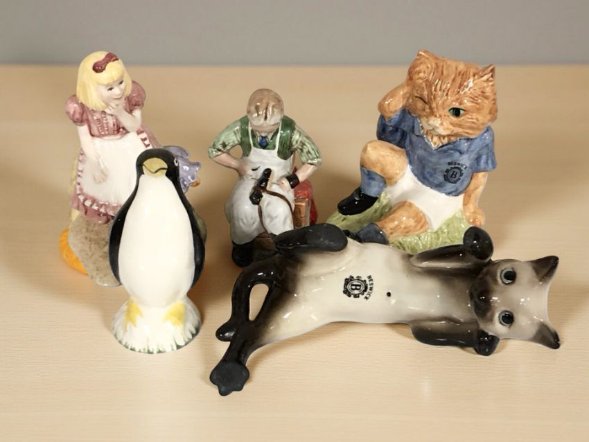 A Beswick siamese cat, together with a footballing felines collection figure 'Mee-Ouch' No. 986 of 1500, further figure of a cobbler, a Royal Doulton Beswick Ware figure 'Alice' No. 1502 of 2500, and a further Beswick penguin.