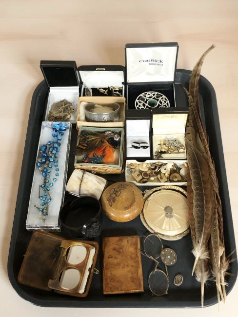 A collection of costume jewellery including cufflinks, a Scottish hardstone brooch, a pair of antique spectacles, a 19th century split pearl and hairwork mourning brooch, a silver and enamel compact (af), a jet bangle, etc.
