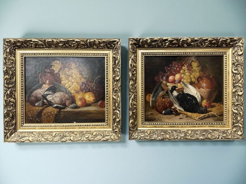 Charles Thomas Bale (1849-1925) : Still Life with Mixed Fruits and Game and Stoneware Pot, oil on canvas, signed bottom left, each 30 cm x 25 cm, together with the companion piece, framed as a pair. (2)