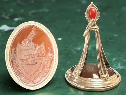 A fine Georgian gold intaglio seal with the coat of arms of the Knox family, 'Moveo et Proficier', 5cm.