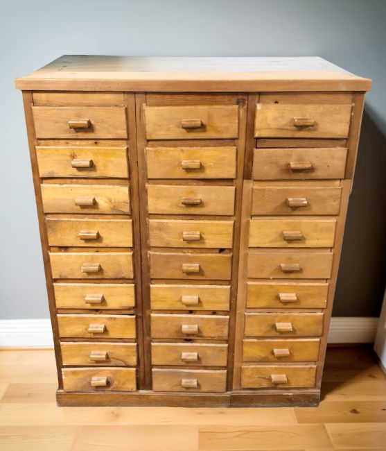 A mid 20th century pine and plywood twenty seven drawer shop storage chest, 90 cm x 32 cm x 108 cm.