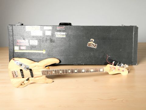 A Diamond Special bass guitar, with driftwood body, together with a hard shell case with various labels.