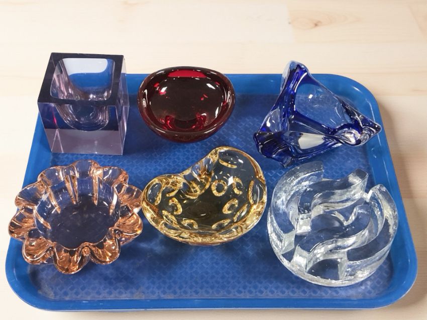 A group of studio glass dishes and bowls including an Austrian Lux bowl