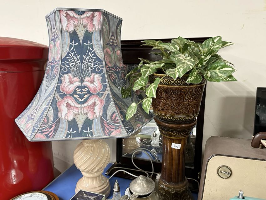 A contemporary mahogany mirror, a pottery plant stand and a table lamp.