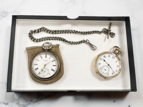 A silver open face key-wound pocket watch signed J H Mercer, Appleby, with silver Albert chain, and an American gold-plated open face pocket watch.