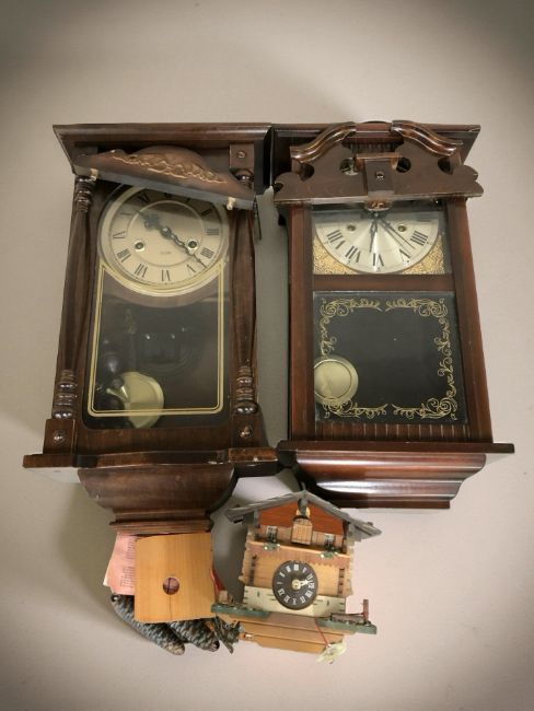 Two reproduction wall clocks and a cuckoo clock. (1 box)