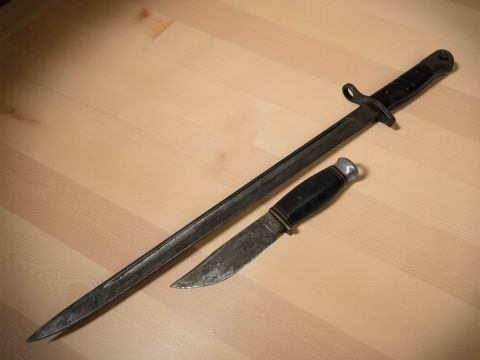 A British 1907 pattern bayonet, together with a hunting knife.