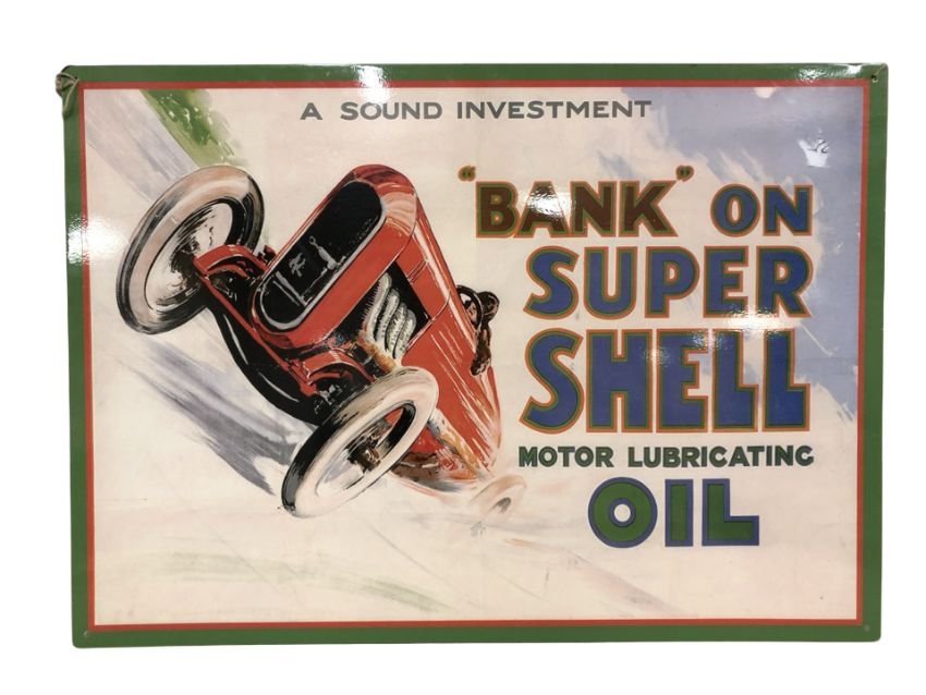A reproduction Super Shell motor oil sign, 50 cm x 70 cm.