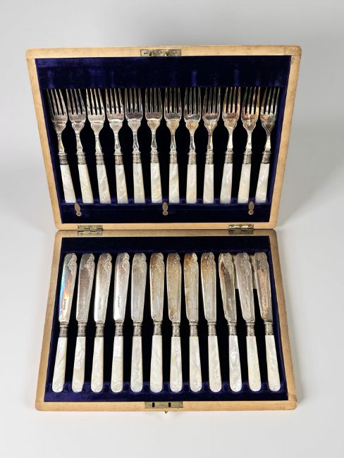 An oak canteen containing a twelve-place setting of EPNS and mother of pearl fish cutlery with silver ferrules