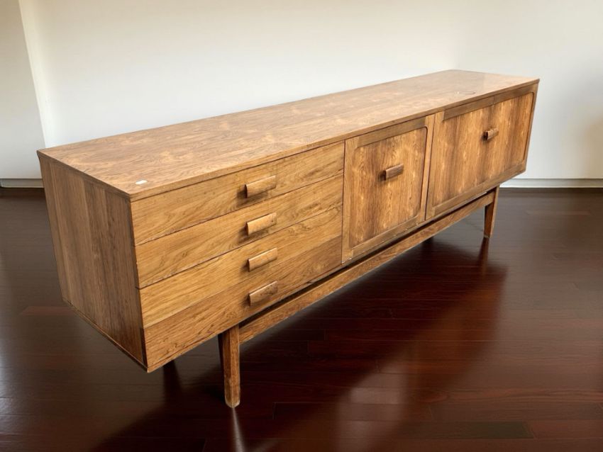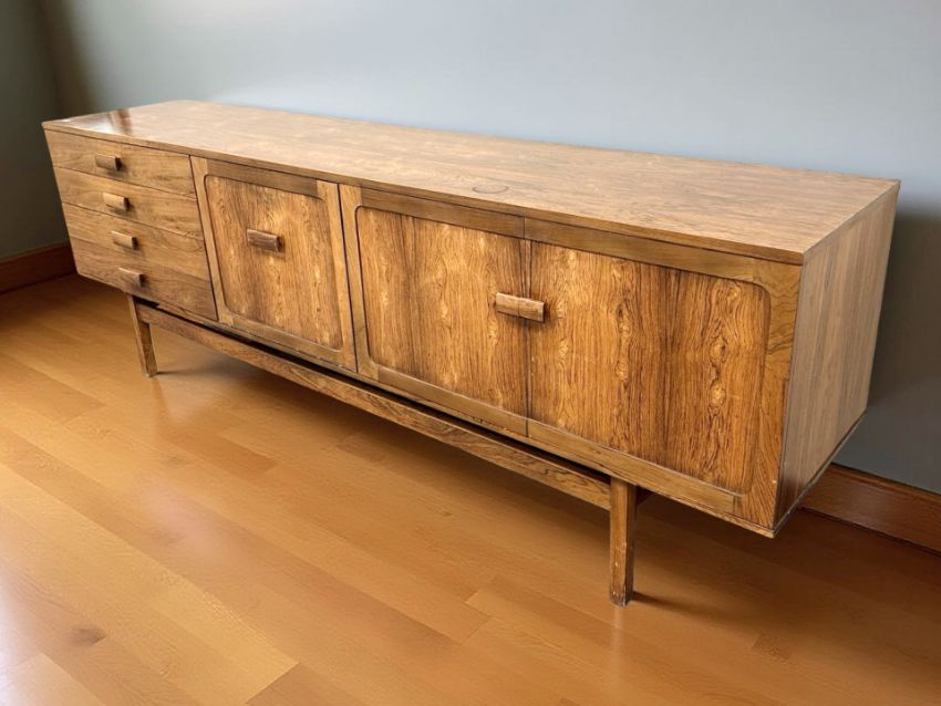 A Bath Cabinet Makers BCM Brazilian rosewood sideboard, circa 1960's, fitted with four drawers and triple cupboard doors, 214 cm W x 46 cm D x 73.5 cm H. With CITES certificate No. 25GBA10Z619VI.