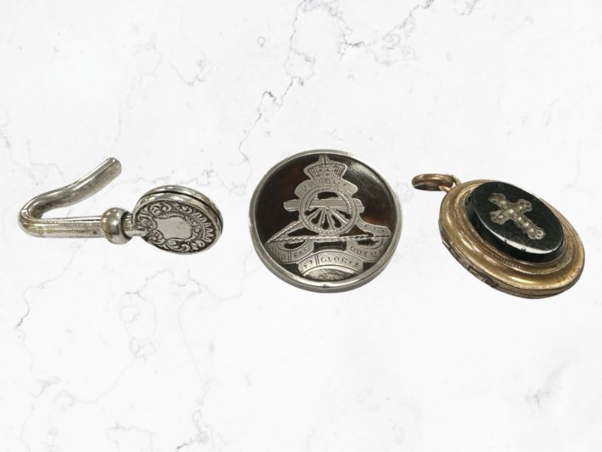 A silver and tortoiseshell Royal Artillery brooch together with a Georgian mourning locket and a white metal napkin clip