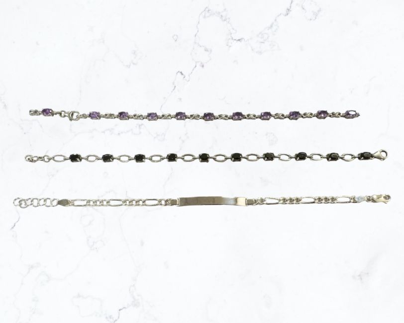 A silver identity bracelet, an amethyst bracelet, and a similar onyx bracelet