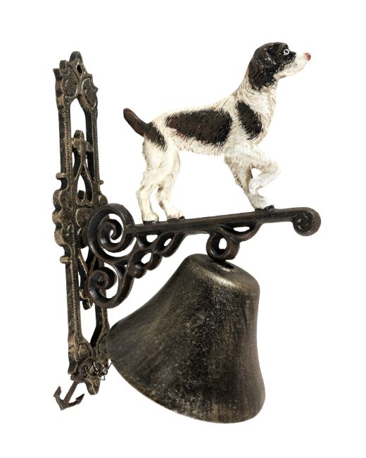 A cast metal spaniel wall bell on bracket, height 35 cm.