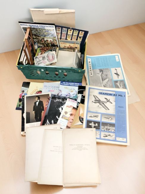 Musical and other ephemera, framed military pictures and prints, football programmes. (1 box)