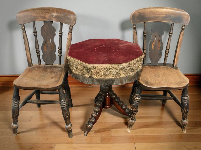 A pair of 19th century beech chairs and a bobbin turned octagonal table with tasseled fabric top.