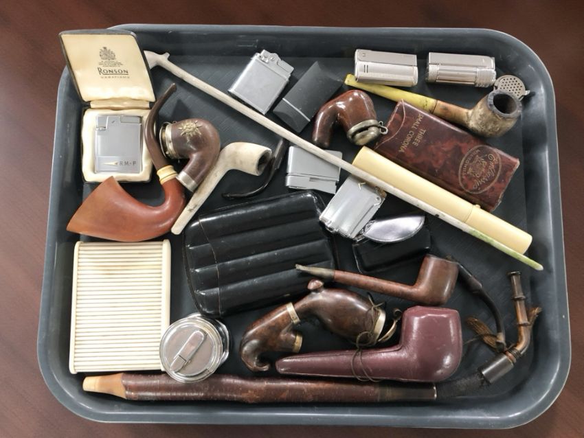 A collection of smoking items including various antique pipes, lighters including Ronson, a leather cigar case, a Colibri table lighter, etc.