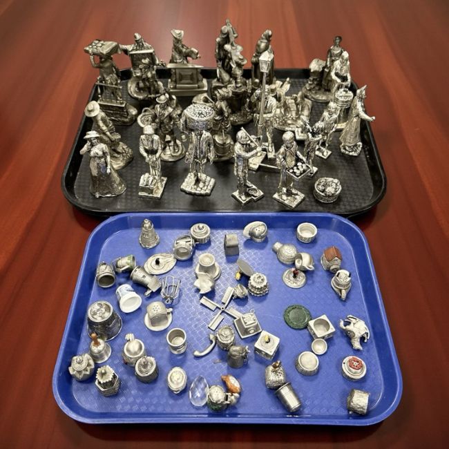 A group of John Pinches fine pewter ornaments, together with further pewter and white metal miniature figures and thimbles. (Q)