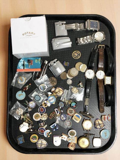 A collection of enameled badges, various coins, lighters including Ronson, wristwatches, pocket knife, etc.