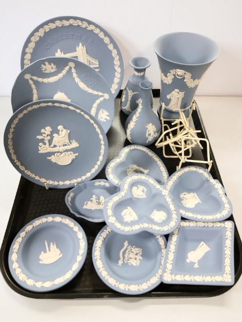 A collection of Wedgwood blue and white jasperware to include plates and shallow dishes, vases, etc.