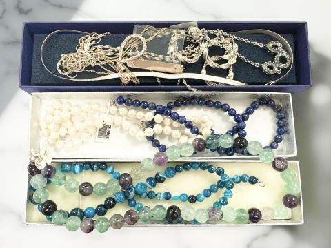 A group of silver necklaces, lapis lazuli and other bead necklaces