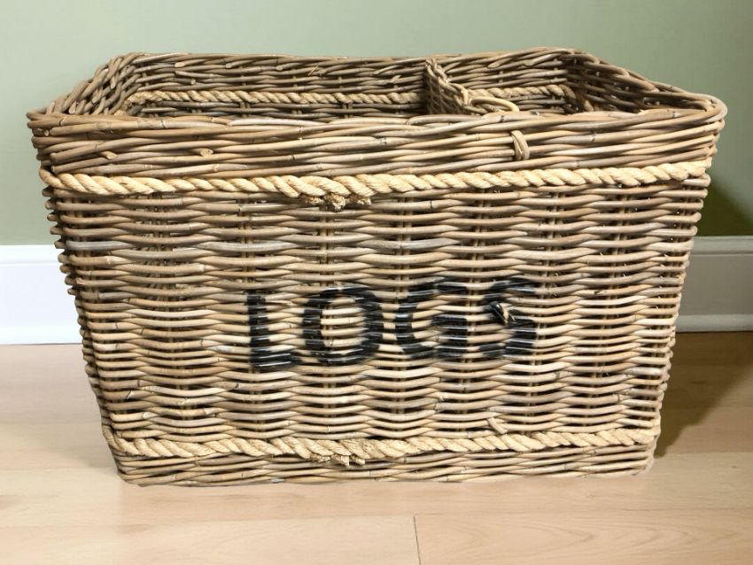 A large wicker two-division log basket, width 83 cm.