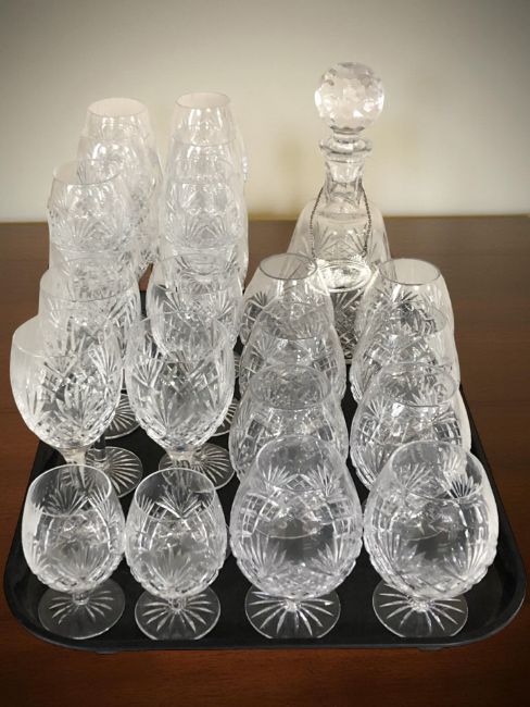 Several sets of crystal drinking glasses including rummers, wine glasses, etc, together with a decanter.