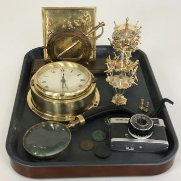 A reproduction ship's quartz brass timepiece signed 'Eurastyle', together with a further nautical themed letter rack, a group of miniature swords on stands, a horn handled magnifying glass, an Olympus Trip 35 camera, coins, etc.