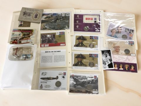 A group of Royal Mail mint stamps, coin covers, albums of Wills and Brooke Bond cigarette cards, further loose cards, etc. (1 box)