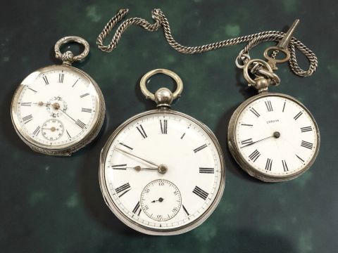 A silver open face pocket watch, case approx 50mm, hallmarked London 1878, together with two lady's silver fob watches with enamel dials, one with a chain (3)