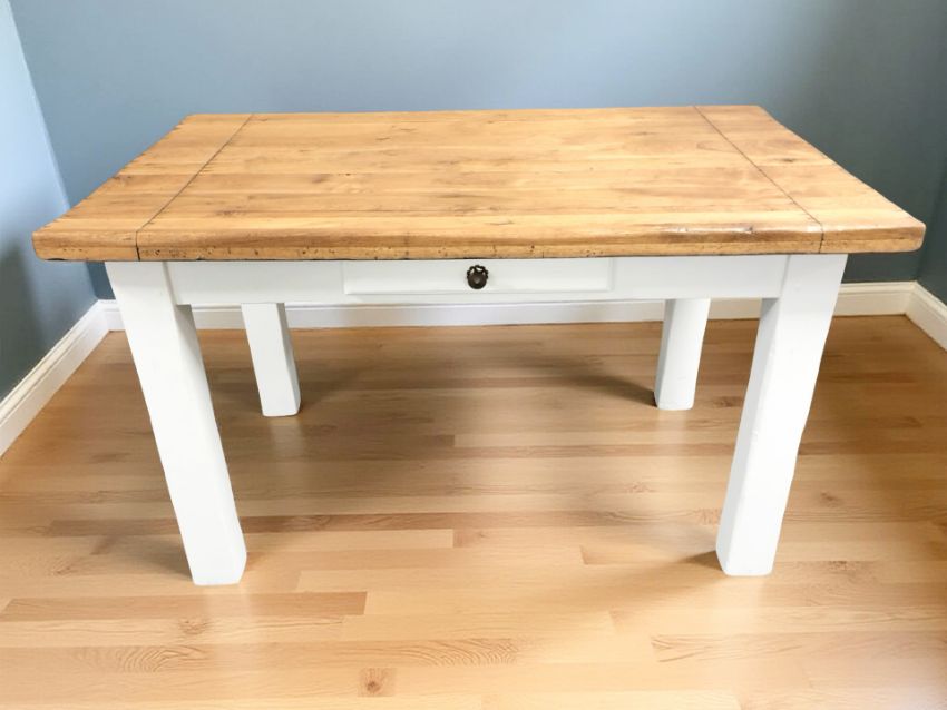 A painted farmhouse style kitchen table fitted a drawer, 130 cm x 77 cm x 76 cm