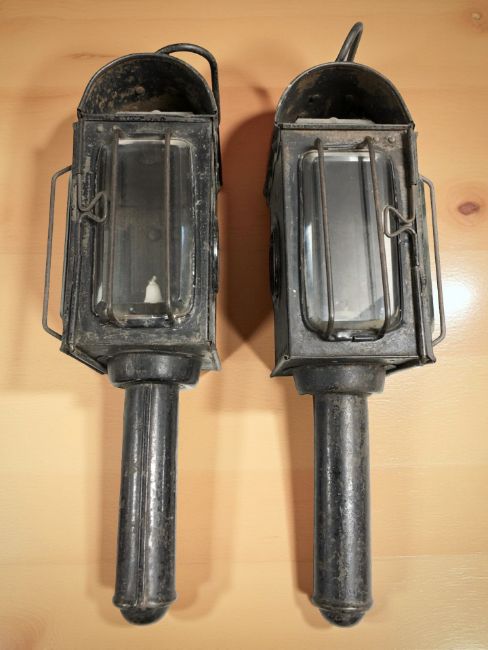 A pair of antique coach lamps containing candles, length 36 cm.